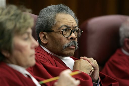 In this May 18, 2006, file photo, Robert M. Bell, left, Chief Judge of the Maryland Court of Appeals, presents U.S. Supreme Court Chief Justice John Roberts with a Maryland flag bowtie at the Maryland Judicial Conference in Cambridge, Md. Bell was 16 years old when he recruited classmates to join a sit-in at a downtown Baltimore restaurant. Twelve demonstrators, including Bell, were charged 50 years ago this month with trespassing in a civil rights case that eventually made it all the way to the U.S. Supreme Court. In the 50 years since Bell v Maryland, Bell, now retired, went on to become a lawyer and later a judge on Marylands highest court, where he sat on the bench with two men who had been prosecutors on his case. (AP Photo/The Star Democrat, Chris Polk, File)