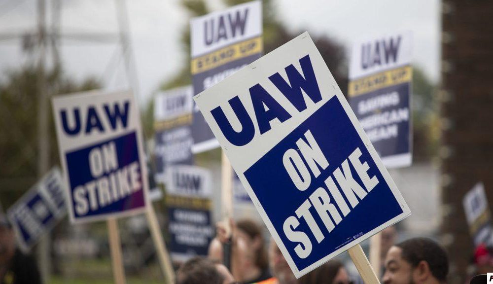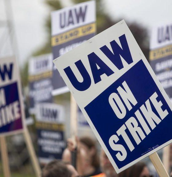 ABOVE: United Auto Workers members strike the General Motors Lansing Delta Assembly Plant on September 29, 2023 in Lansing, Michigan....