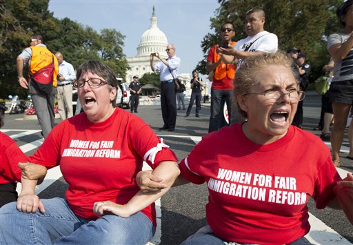 This Sept. 12, 2013 file photo shows women linking their arms and sit in a circle to block the intersection of Independence Avenue SE and New Jersey Avenue SE outside the House of Representatives on Capitol Hill in Washington to protest Congress’ inaction on comprehensive and inclusive immigration reform. (AP Photo/Carolyn Kaster, File)