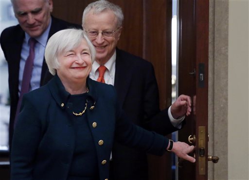 In this Monday, Feb. 3, 2014, file photo, Janet Yellen, followed by her husband, Nobel Prize winning economist George Akerlof, smiles as she walks into a room of applause by staff members before she is administered the oath of office as Federal Reserve Board chair, at the Federal Reserve in Washington. Yellen is the first woman to lead the Federal Reserve. (AP Photo/Charles Dharapak, File)