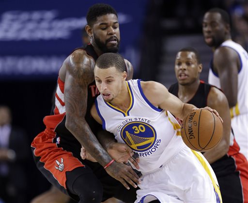 Golden State Warriors’ Stephen Curry (30) is defended by Toronto Raptors’ Amir Johnson during the first half of an NBA basketball game Friday, Jan. 2, 2015, in Oakland, Calif. (AP Photo/Marcio Jose Sanchez)