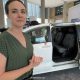 While visiting Arkansas State University for the April 8 eclipse, Taylor Williams of Memphis shows little Lee Eric a projection