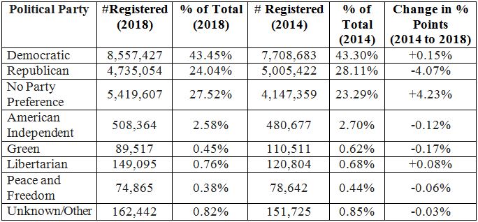 SACRAMENTO – Secretary of State Alex Padilla released the final statewide Report of Registration ahead of the November 6, 2018, Statewide General Election. An all-time record of 19,696,371 Californians were registered to vote at the 15 day voter registration deadline on October 22, 2018. This is an increase of 1,892,548 registered voters since the last Gubernatorial Election (2014).