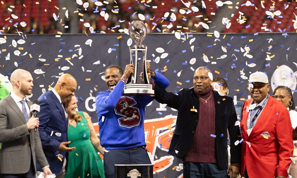 “Last year I stood right by our locker room outside, still in the stadium, and I watched confetti drop on another team, and that fueled me,” South Carolina State Head Coach Chennis Berry said. “And I said, ‘If the good Lord gives me another opportunity, that confetti will not drop on another team – that confetti is going to drop on us.’ … We knew we would be here, but we wanted to walk away this time with a trophy in hand. As I stand here today, we did just that.”
